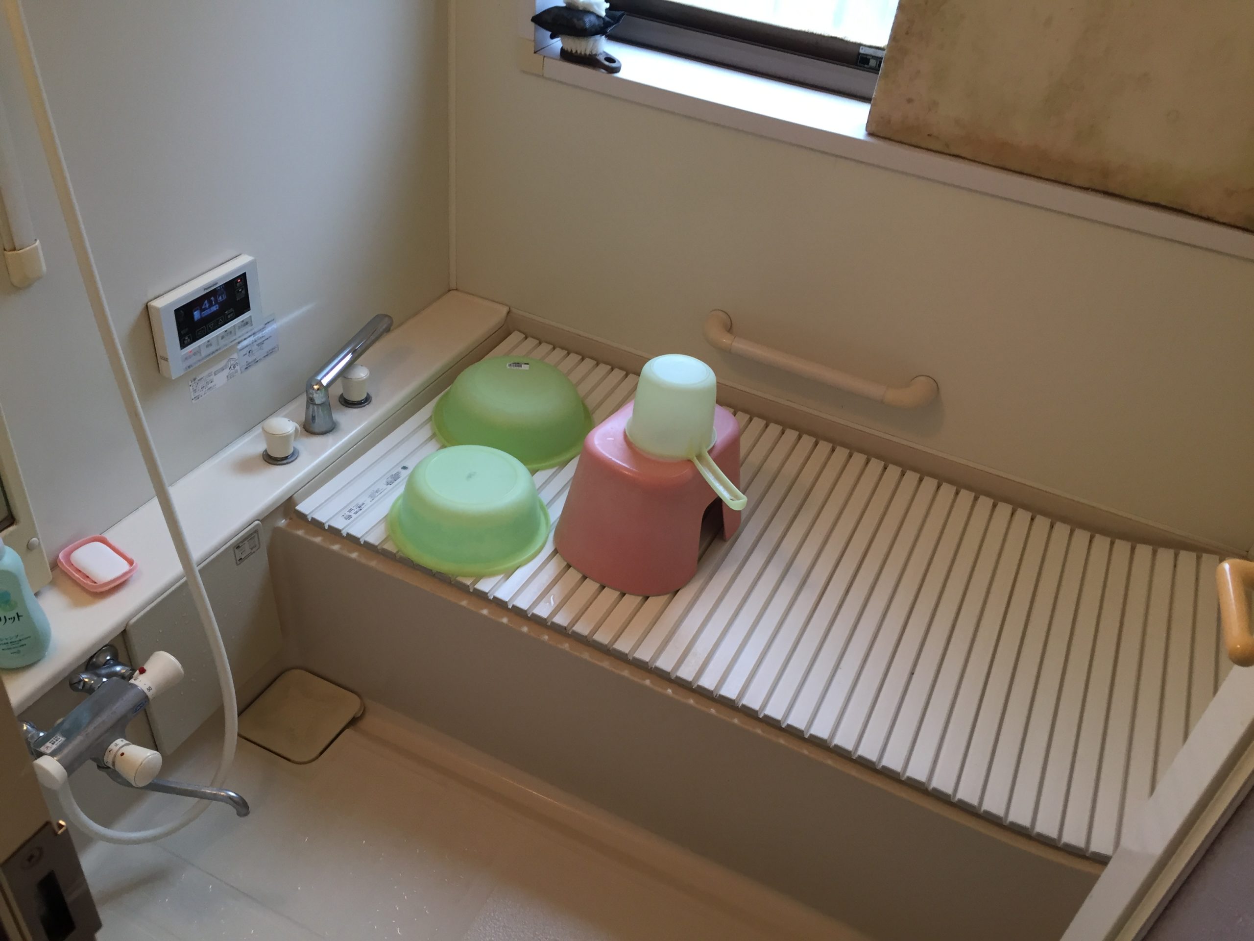 既存のお風呂はなぜか入口に5センチほど上がっている所にドアが設置されており、出入りに気を遣う危険な状態でした。